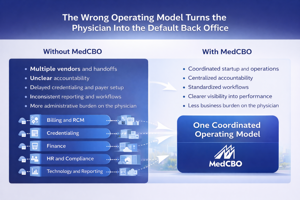 MedCBO helps physicians launch, stabilize, and grow independent practices with integrated support across startup planning, payer contracting, credentialing, revenue cycle, finance, compliance, and operations.